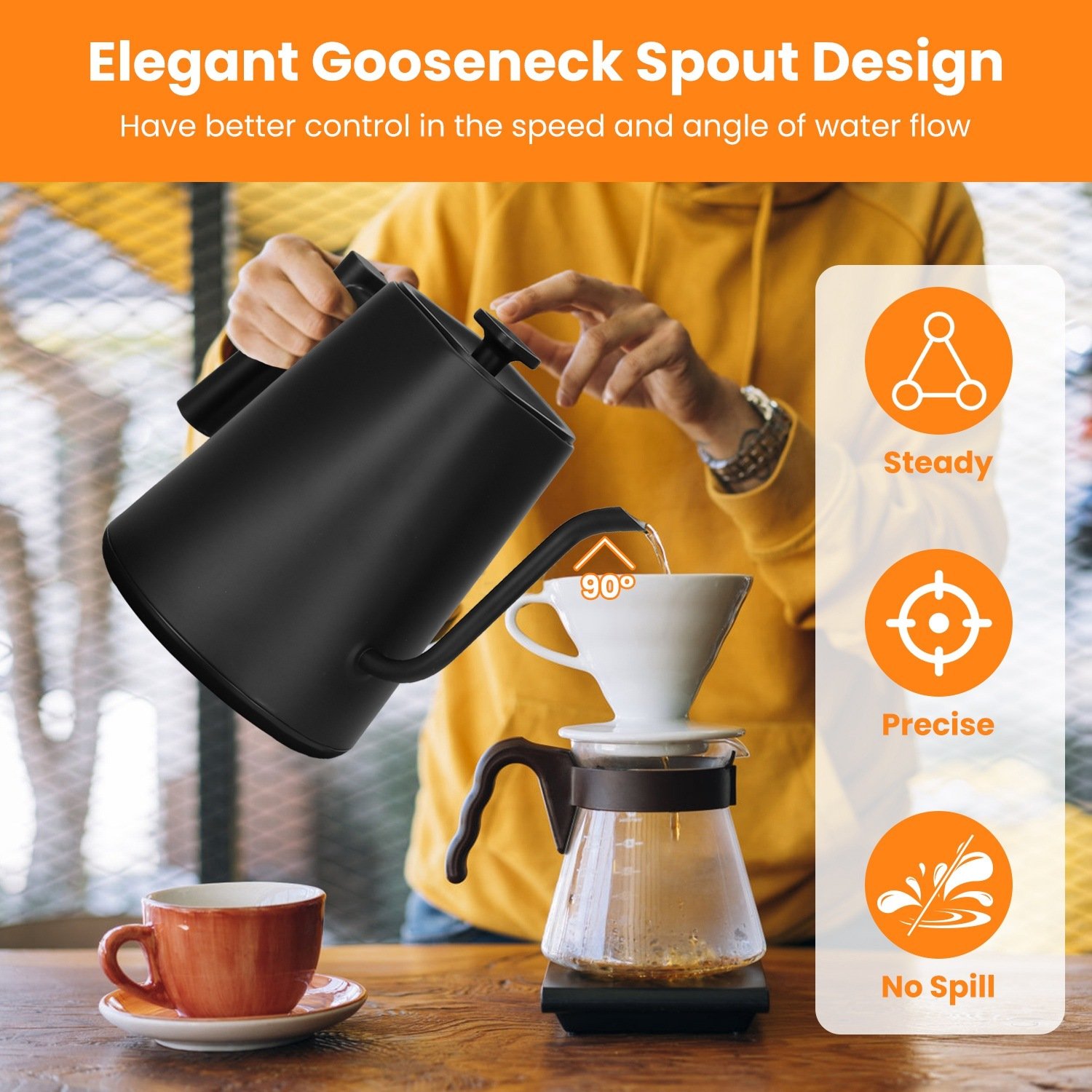 *Perfect Gift*:The sturdy and ergonomic handle is comfortable to grip,and the bottom of the kettle base is equipped with anti-slip pads,ensure the stability and prevent tipping. Our gooseneck electric water kettle with classic and simple appearance is also a perfect gift for your friends,family,colleague in this chilling winter!.