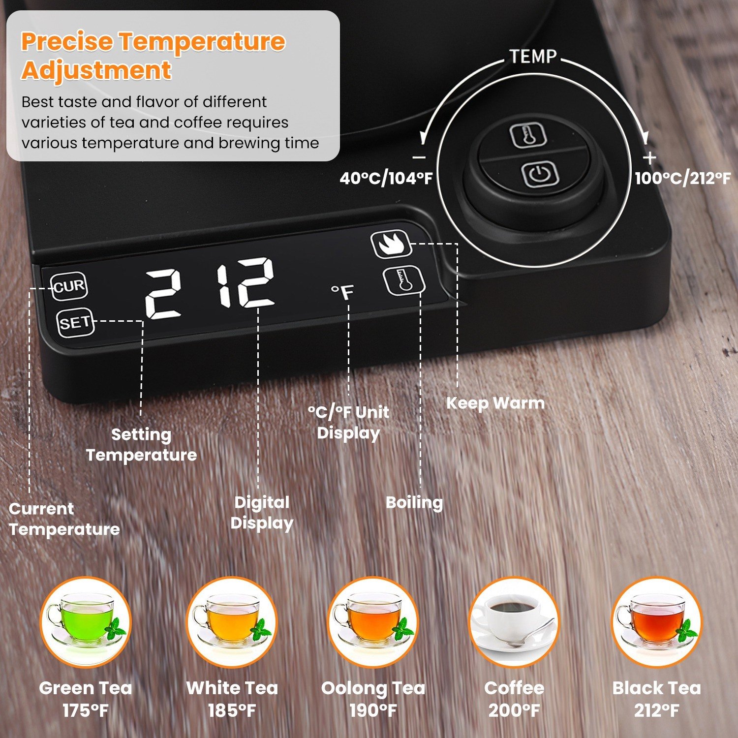 *Precise NTC Temperature Control*:Come with accurate temperature adjustment from 104°F to 212°F,you can just slightly rotate the knob and read the current or setting temperature in the digital screen of electric gooseneck kettle. After all,the best taste and flavor of different varieties of tea and coffee requires various temperature and brewing time. Besides,you can choose the Fahrenheit and Centigrade display temperature unit according to your personal habits.