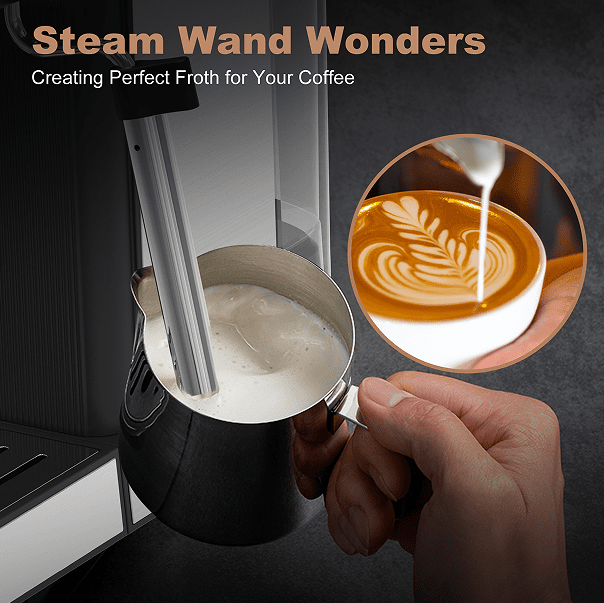 Stable steam performance-Using our machine's powerful steam bar, effortlessly bubble milk for lattes and cappuccino coffee. Enjoy the luxurious cream foam and enhance your coffee experience. The removable foam nozzle ensures easy cleaning and ease of use.
