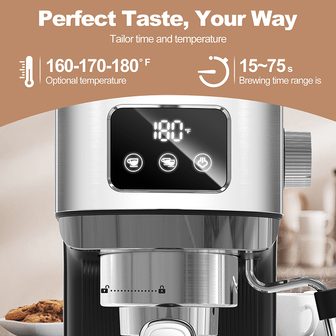 Customizable extraction control- -adjust the extraction time and temperature to suit your preferences to control the coffee strength and flavor characteristics. This level of control enhances the overall coffee experience, allowing you to perfectly customize each coffee cup.