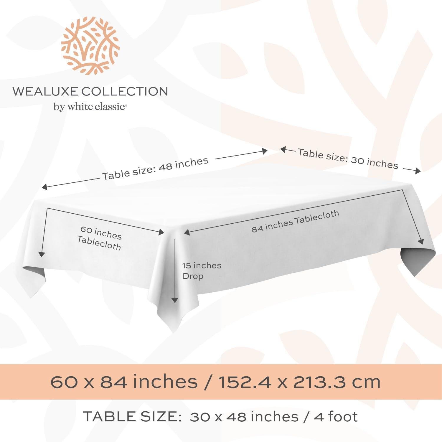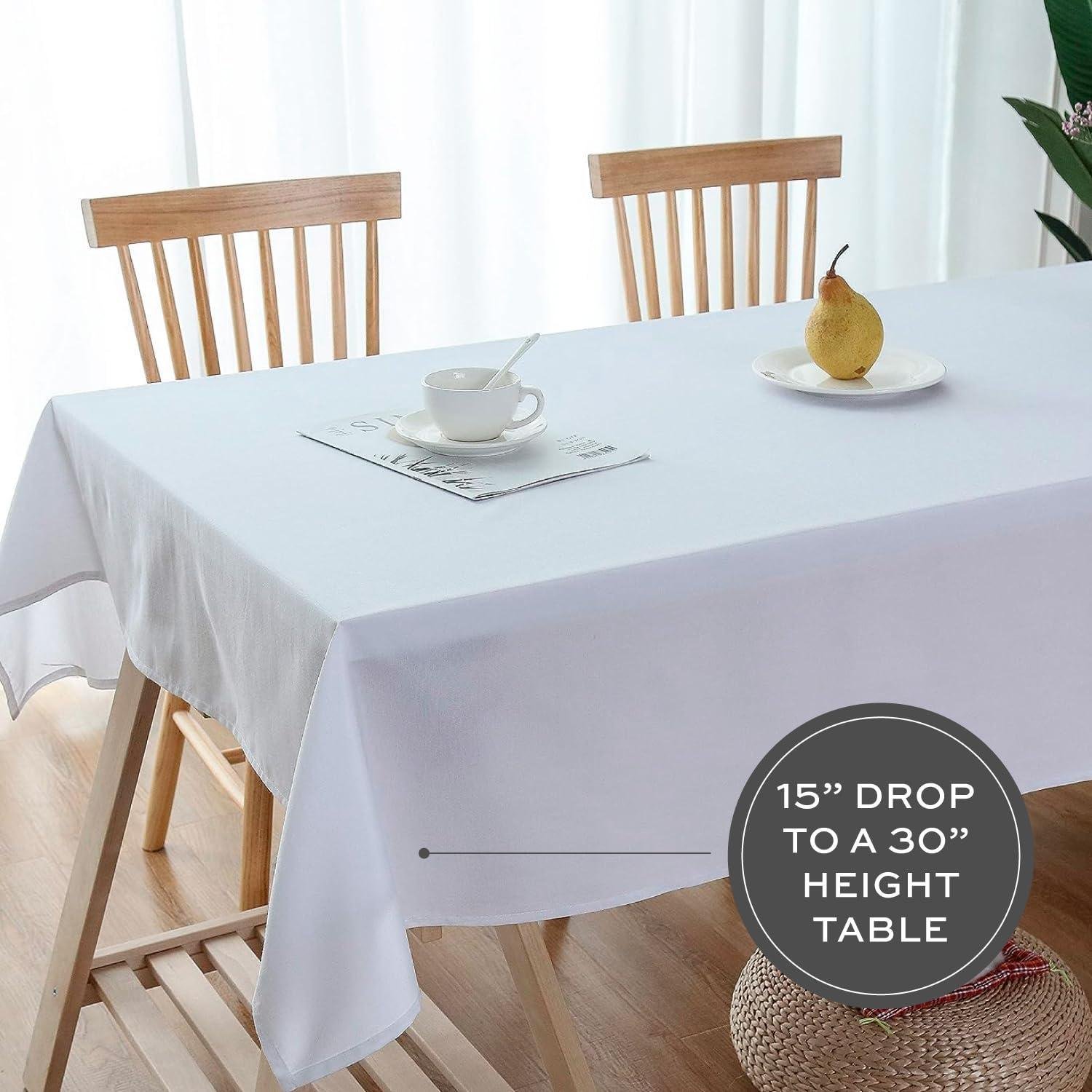 1.tablecloth for rectangle tables - 60 x 84 inch fitted white table protector with 15 inch drop if use for 4 foot dining table; 100% polyester 200gsm tablecloths fabric is durable and can withstand multiple washes;