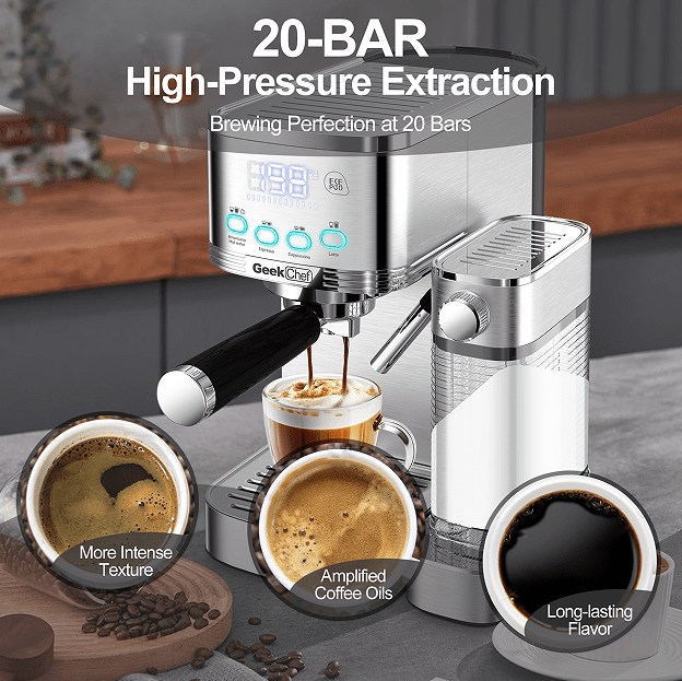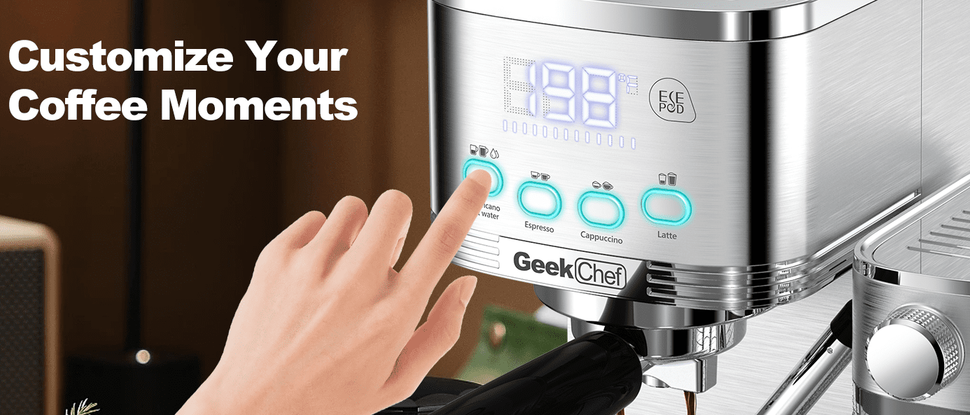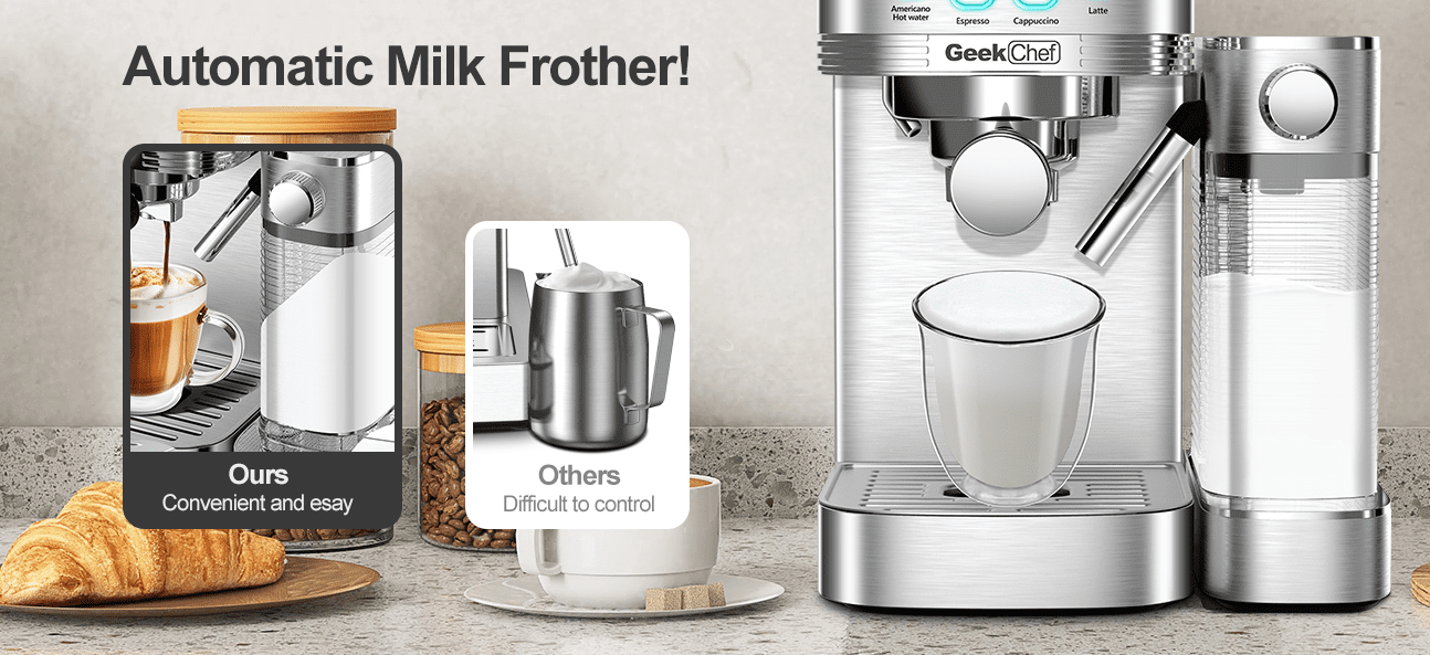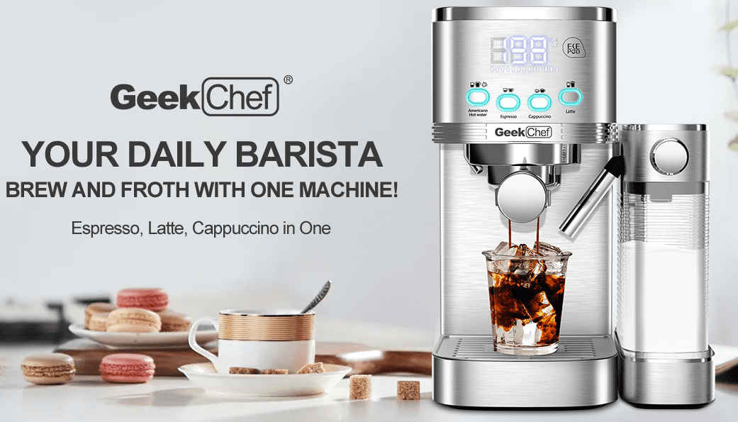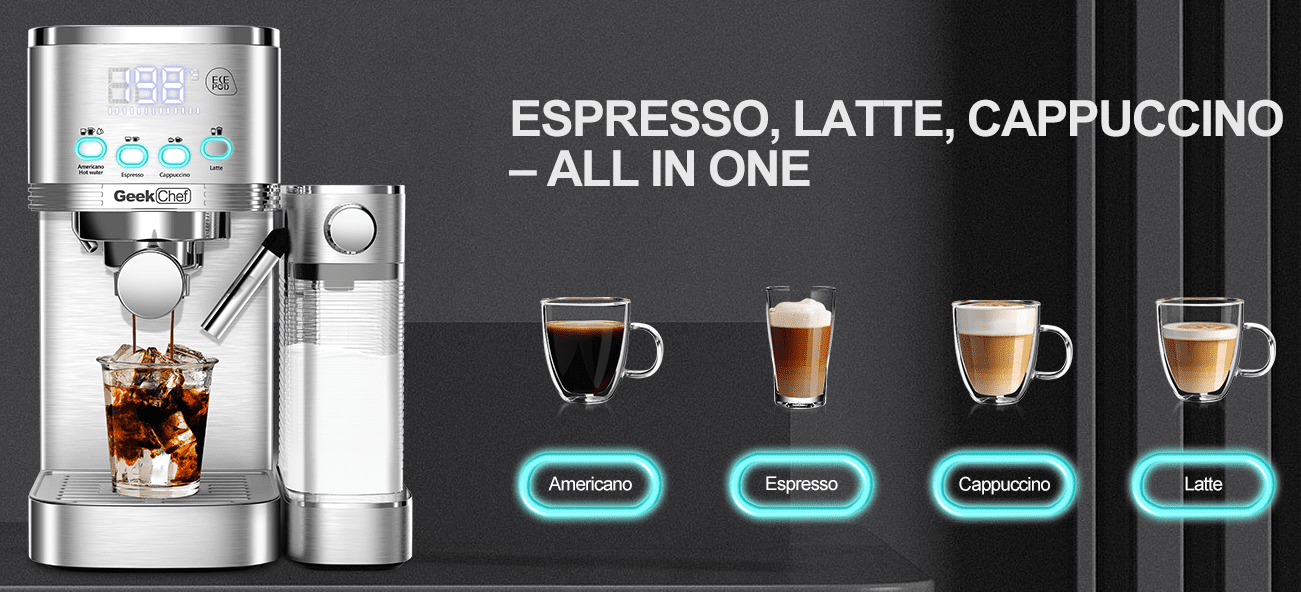 All your favorite coffee is in a machine-a Geek Chef coffee maker with an automatic milk foam that allows you to brew americano, latte, cappuccino or macchiato at home.