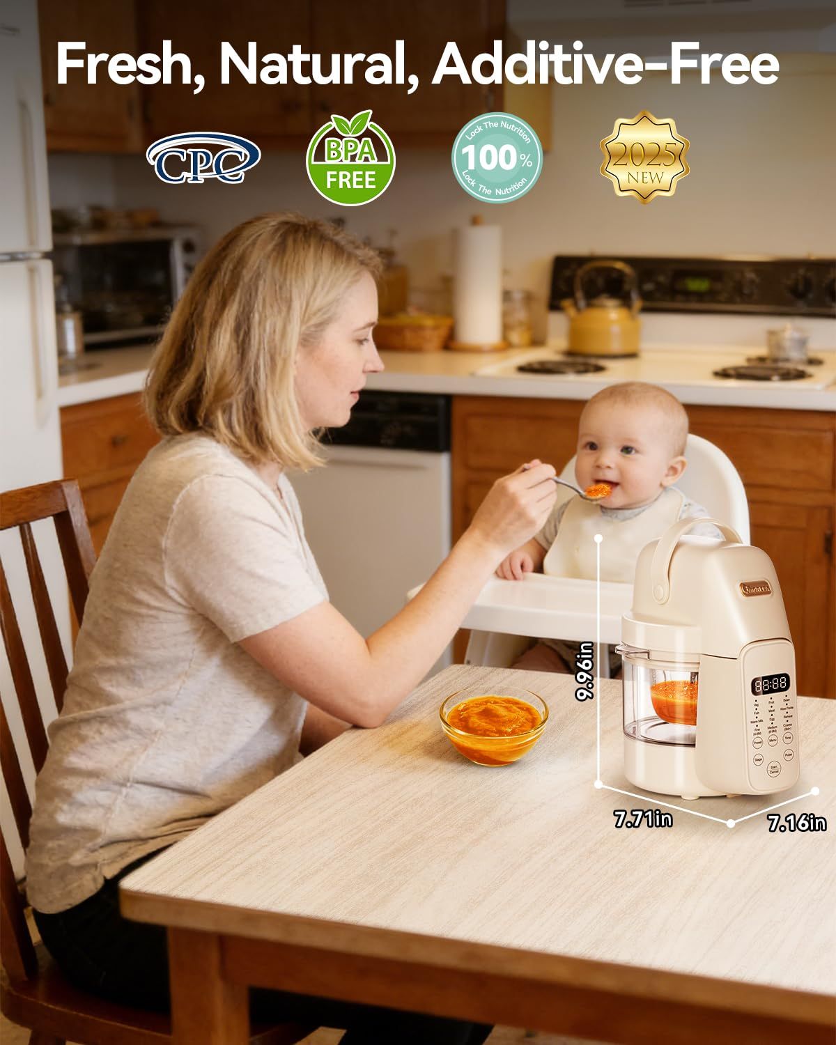 1. One-Step Baby Food Processor: All-in-one processor blending and heating with preset modes. Schedule meals 24h ahead: add ingredients at night, wake to warm puree. Perfect for busy moms wanting quick, nutritious meals.