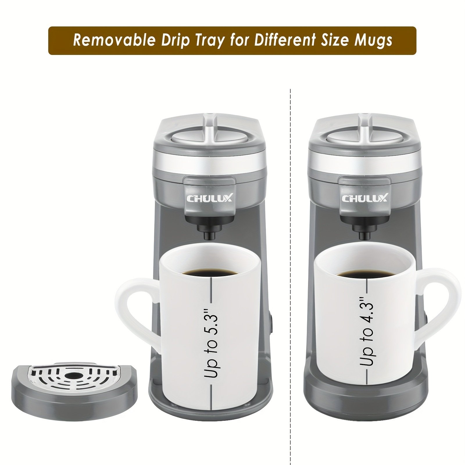 4, (BUILT-IN RESERVOIR + DETACHABLE DRIP TRAY)The water amount you pour equal to coffee amount that flows out,ensure every fresh cup.Without any mess.The single brewer supports for standard size,or by removing drip tray for large size mug (up to 5.3" height).