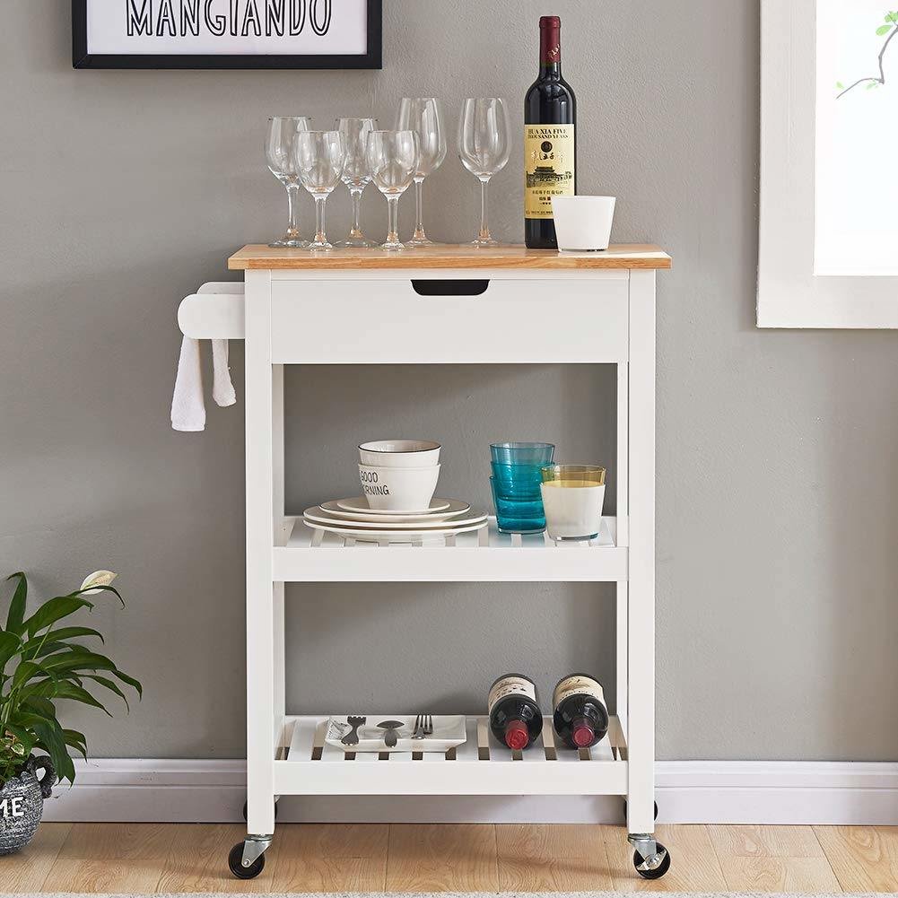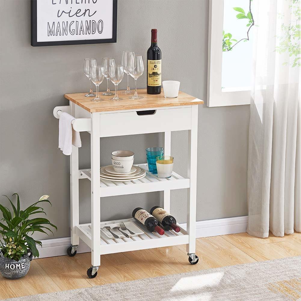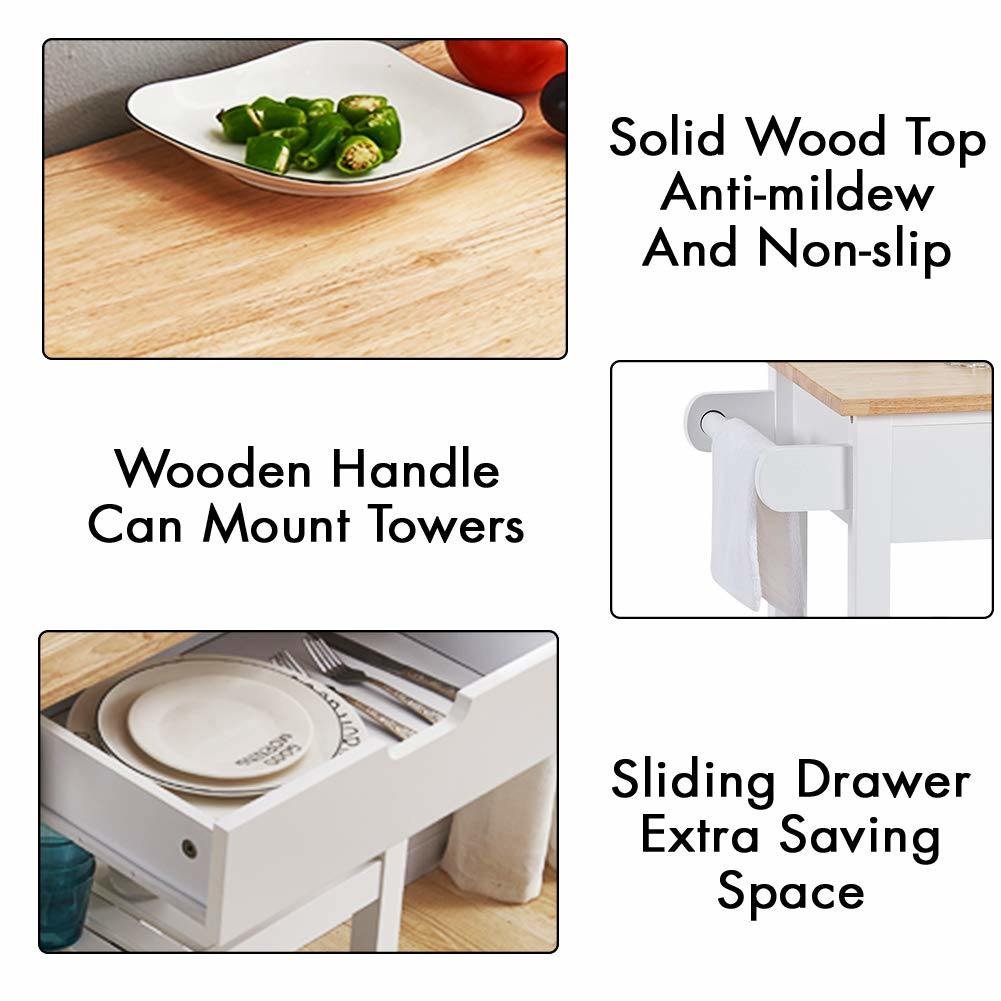 1.Durable Material - The rolling kitchen cart is made of high quality materials, pinewood, particle board and MDF with a coating surface for durable and long-time service. Kitchen cart top is made of rubber wood rubber veneer, and these wooden material will not harm your health.