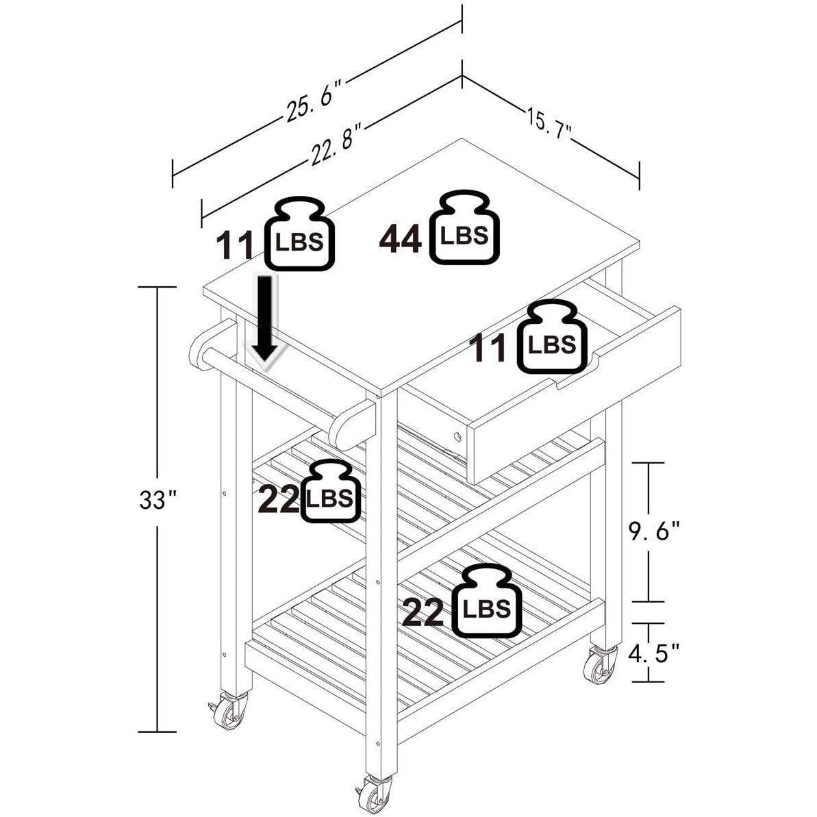 5.Sturdy and lightweight - The frame structure of solid wood makes kitchen roller cart very sturdy and lightweight. The kitchen island top of the cart is made of whole piece of rubber wood,which is used eco-friendly varnish to protect it from grease stains and water.