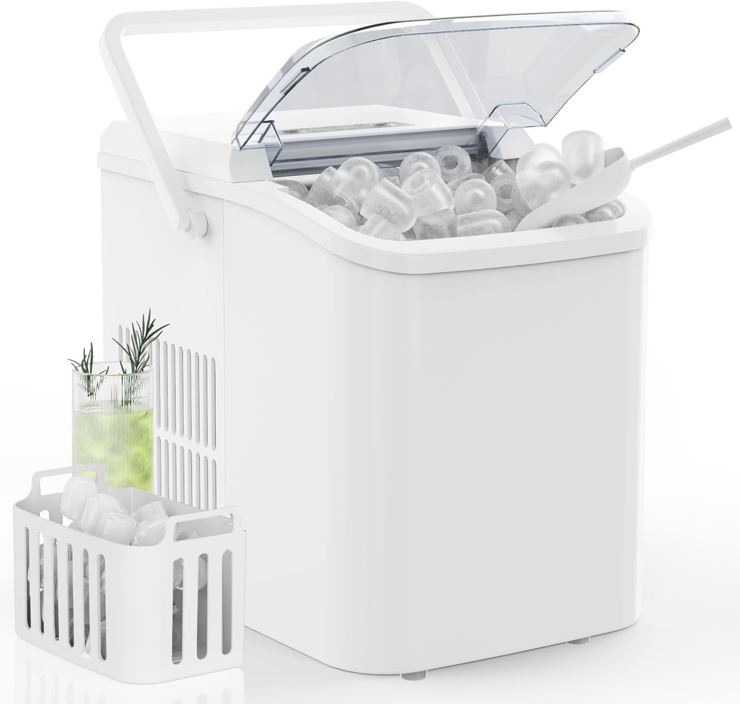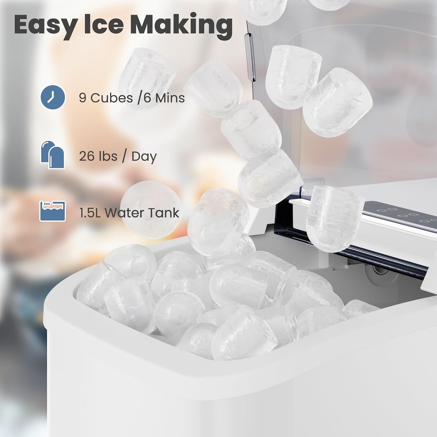 Desktop ice maker, it only takes 6 minutes to produce 9 bullet-shaped ice cubes. With a 1.5L water tank, the maximum daily ice-making capacity can reach 26.5 pounds, meeting various needs such as daily household use, gatherings with friends, and beverage preparation. The transparent window design allows you to observe the ice-making process in real time.