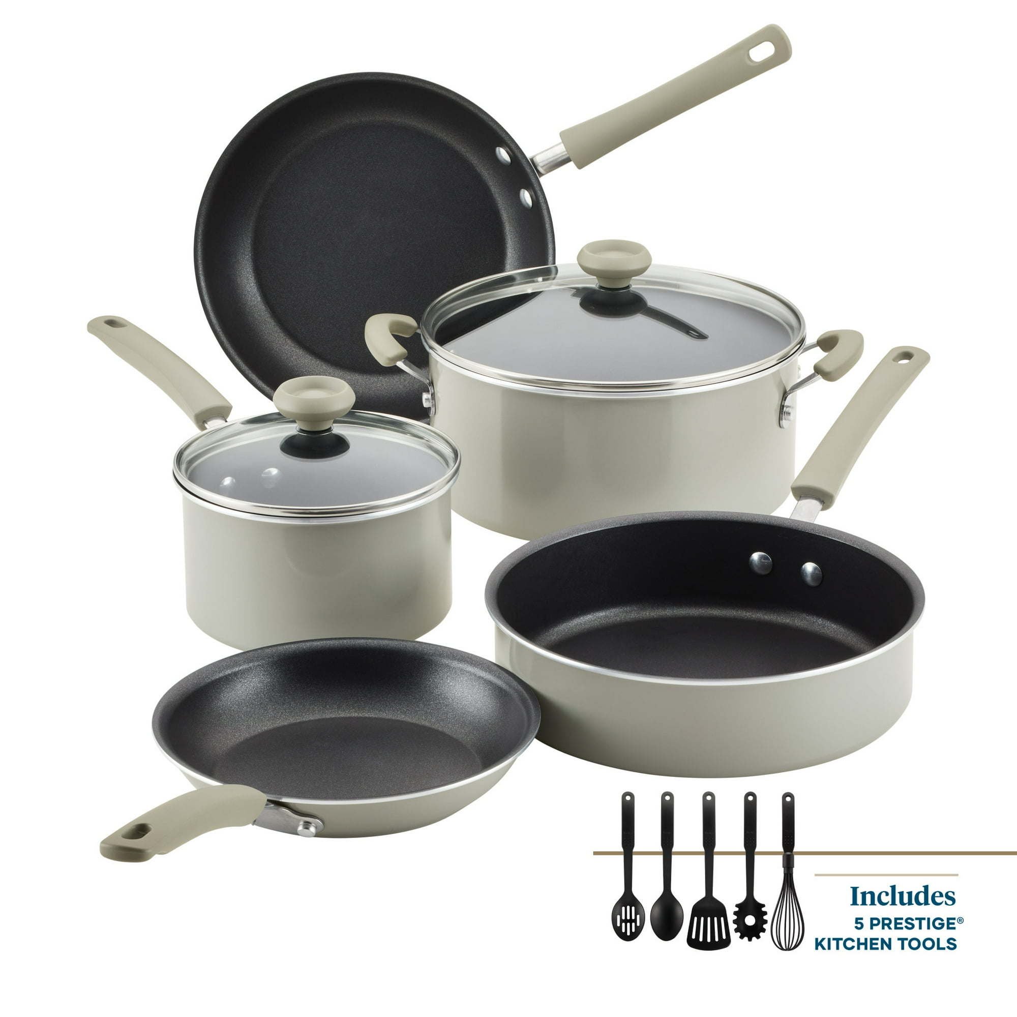 WHAT'S INSIDE: 2-quart saucepan with lid, 5-quart dutch oven, 3-quart saute pan with lid (lid also fits Dutch oven!), 8.5-inch frying pan, 10-inch frying pan, and (5) Prestige kitchen utensils: slotted turner, slotted spoon, solid spoon, pasta fork, whisk