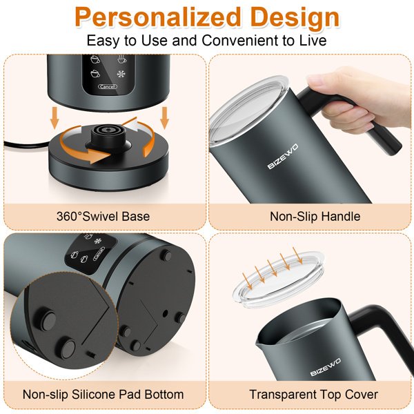 • ☕4 in 1 Coffee Frother: BIZEWO electric milk frother has four functions, namely hot dense foam, heating milk, hot airy foam, and cold milk froth, which can meet your multiple needs at the same time. All year round you can DIY coffee drinks at home and enjoy a different experience. With LED touch screen panel, the buttons are sensitive and easy to operate. The milk frother will beep when the production is complete to indicate that you have finished making