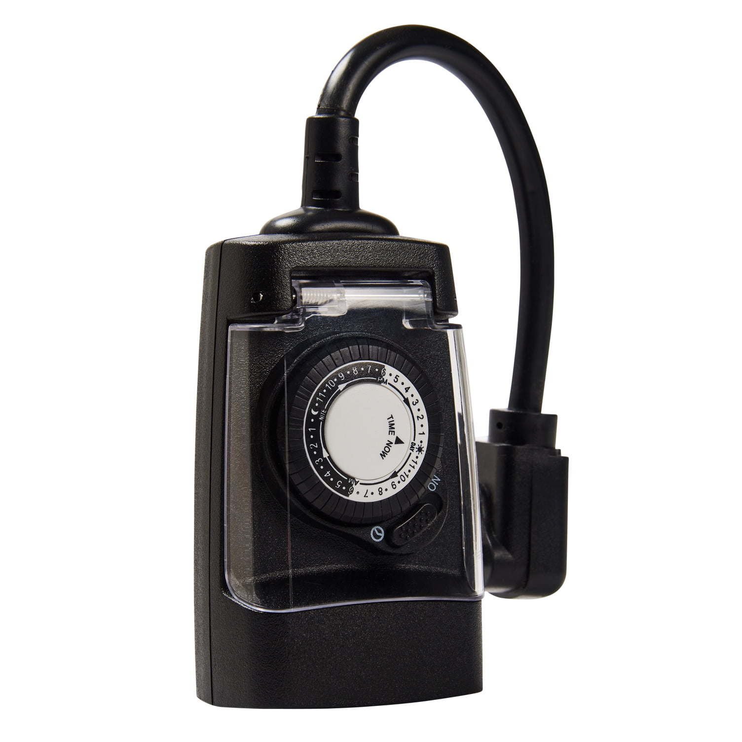 Hyper Tough Analog Outdoor All-Weather Timer with 3- prong outlet will automate your home with on and off set times. Timer is easy to set in 30-minute intervals and provides up to 24 hours ON/OFF setting per day. Pins are easy-to use and built-in for convenience. Push pins down or pull up to set your on and off time. Features a weather resistant latch cover, 6-feet heavy-duty flexible cord for hard to reach angles and a manual override switch.