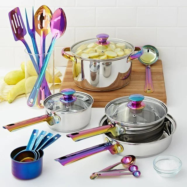 Iridescent Stainless Steel 20-Piece Cookware Set, with Kitchen Utensils and Tools