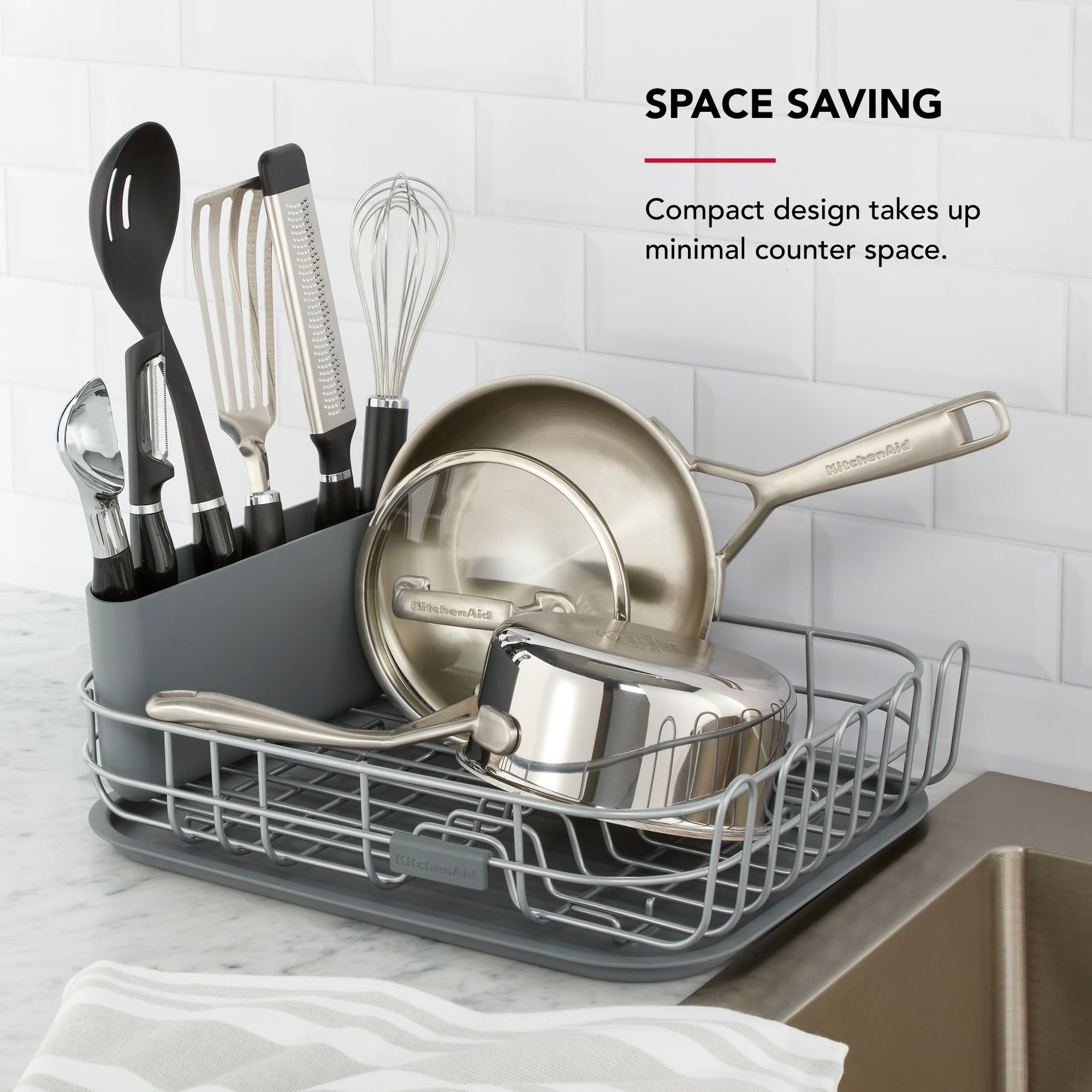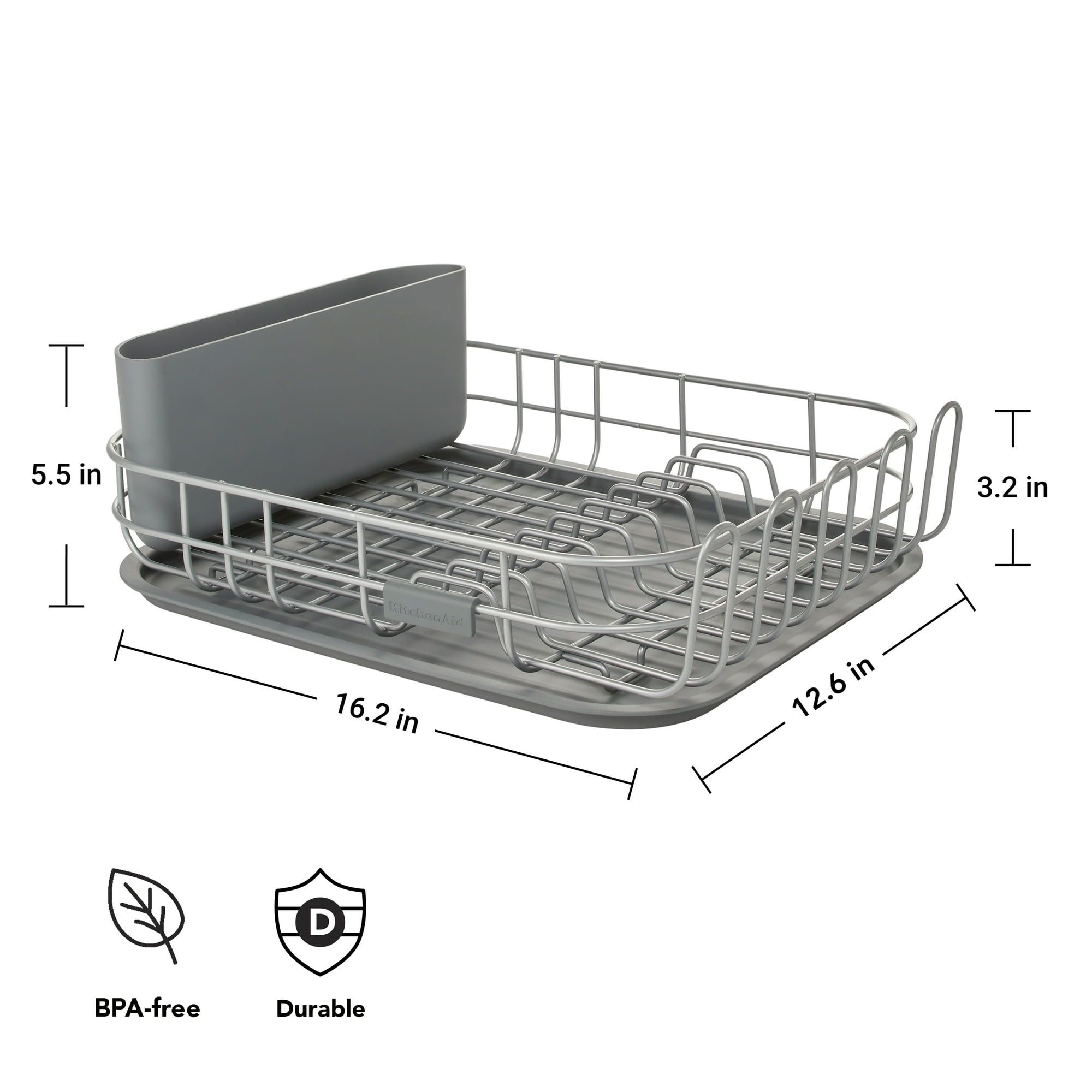 COMPACT RACK: dish drying rack is sized to fit smaller kitchen counter spaces.OPEN DESIGN: wire frame construction provides breathing room for air drying.ROOM FOR VARIOUS DISHES: rack features a utensil holder, space for bowls and glasses, slots for dishes, and hooks for mugs.DURABLE CONSTRUCTION: wire frame rack is made of carbon steel; utensil holder and tray are made of plastic.EXCESS WATER: drainboard prevents excess water from draining onto countertops keeping them clean and dry.