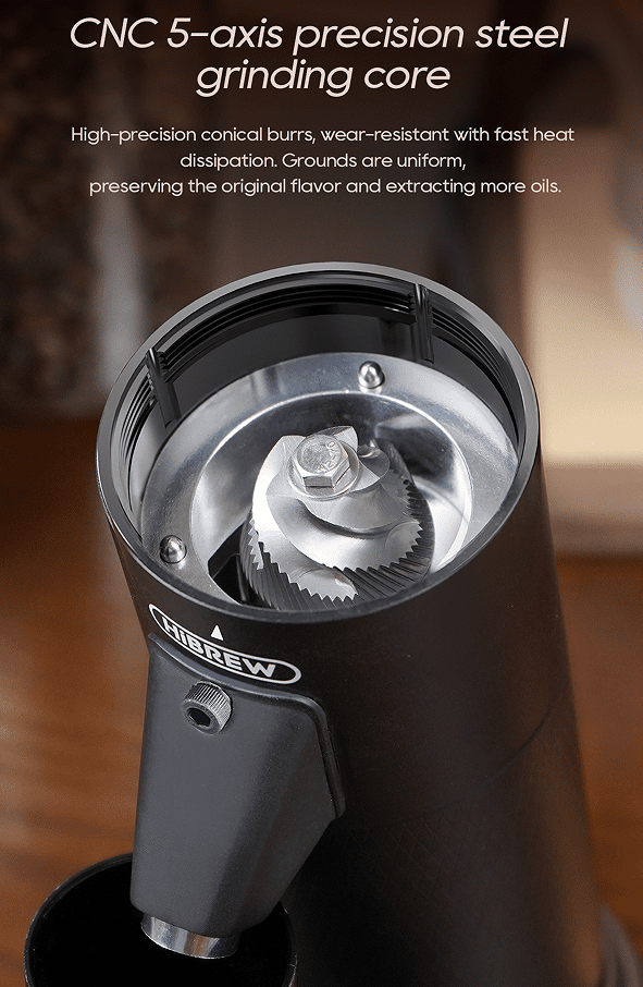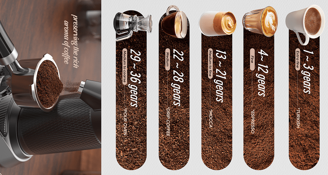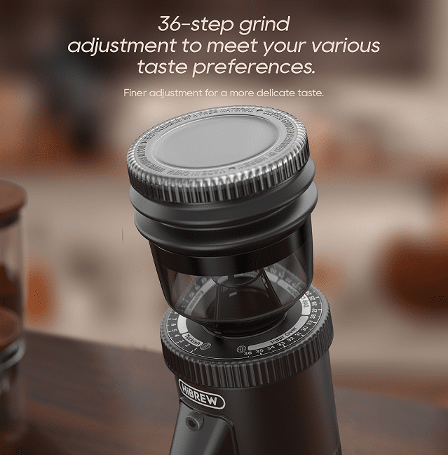 This coffee grinder features a 48mm high hardness CNC cone grinder with a 36 level adjustable grinding setting for your different espresso / Turkish / pour / dump / mocha / drip coffee needs.