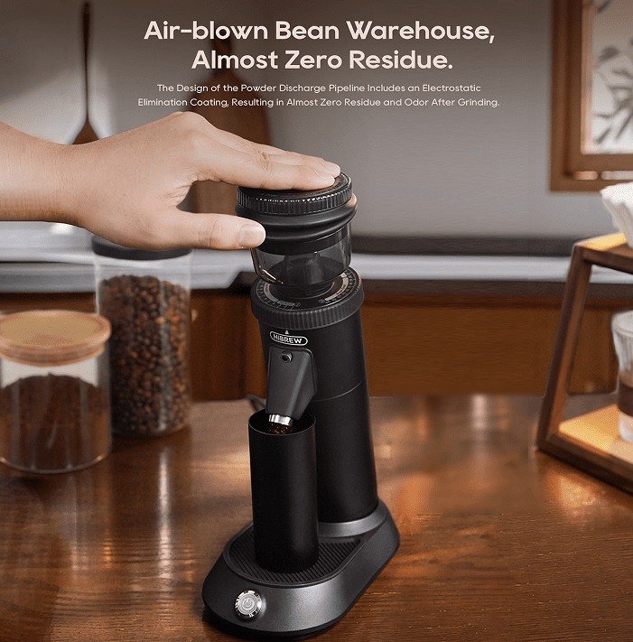 During the grinding process, gently press the powder distributor on the top of the bean box, which can effectively reduce the accumulation of coffee powder. The outlet of the coffee powder has an anti-static coating, which can reduce the residue of the coffee powder inside.