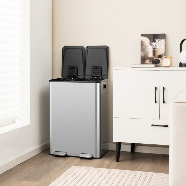 This Dual 8-Gallon Step Trash Can Recycle Bin Food Waste Kitchen Compost Container would be a great addition to your home. Double 8 gal/30 L barrel for easy waste sorting of recycled waste and kitchen garbage. Stainless steel frame is robust, rustproof, fingerprint resistant and easy to clean. Built with 3 layers, stainless steel layer, drawing wire layer and anti-fingerprint layer. Thoughtful stay-open design allows you to deal with long-time chores. Comes with smooth opening and slow closing to lower noises while using. Deodorizer compartment to store deodorizers to avoid weird smells. Facilitate multi-scene use, like office, kitchen, dining room, etc. Fitted with the durable stainless steel pedal for effortless controlling. Anti-slip foot pads will keep stable and avoid scratches. Can be moved anywhere for wide use, thanks to side handles. Needs no installation, can be used as long as you unpack it.