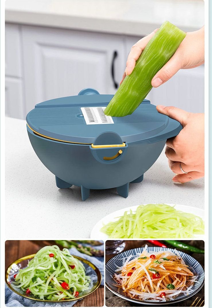1.Kitchen Gadget: In this slicer and shredder set there are 6 replaceable interchangeable stainless steel cutters,a food container, a colander with handle, a hand protector, a peeler. Grater with container makes slices fruit and veg do much easier.