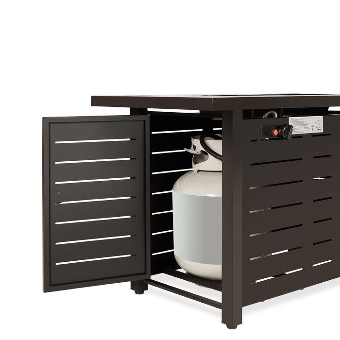 Relax and stay warm all winter long with this 50,000 BTU Brown Steel LP Gas Propane Fire Pit w/ Auto Ignition. Change and conceal your gas tank quickly with a convenient tank holder hidden behind a side door that works with a standard 20 lbs. propane tank. Propane tank is not included. Heavy-duty rust- and weather-resistant steel panels with a matching frame protects a powerful heating element and ensures years of outdoor heating. Enjoy an elegant accent to your burner, or cover the burner and have an attractive table to share light meals and drinks with guests. A durable nylon cover ensures this fire pit table will withstand the elements when not in use.