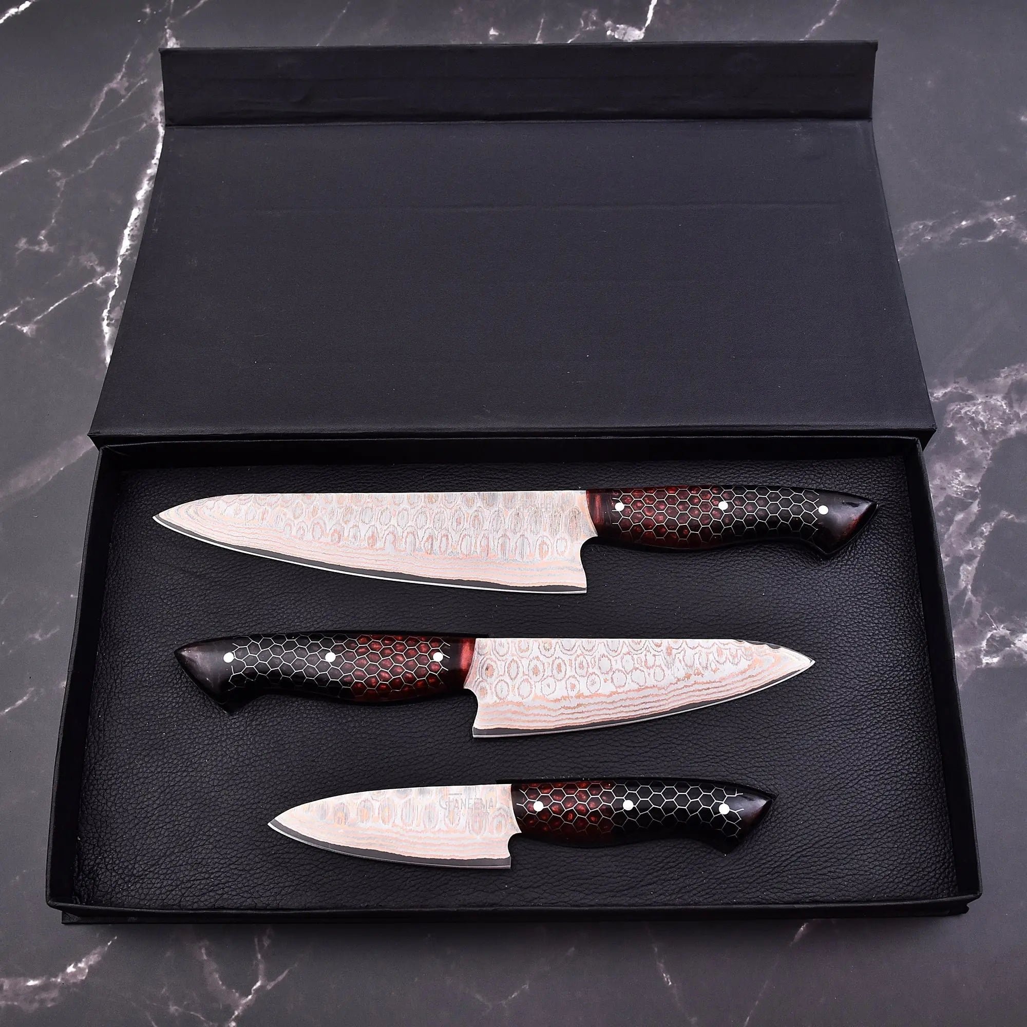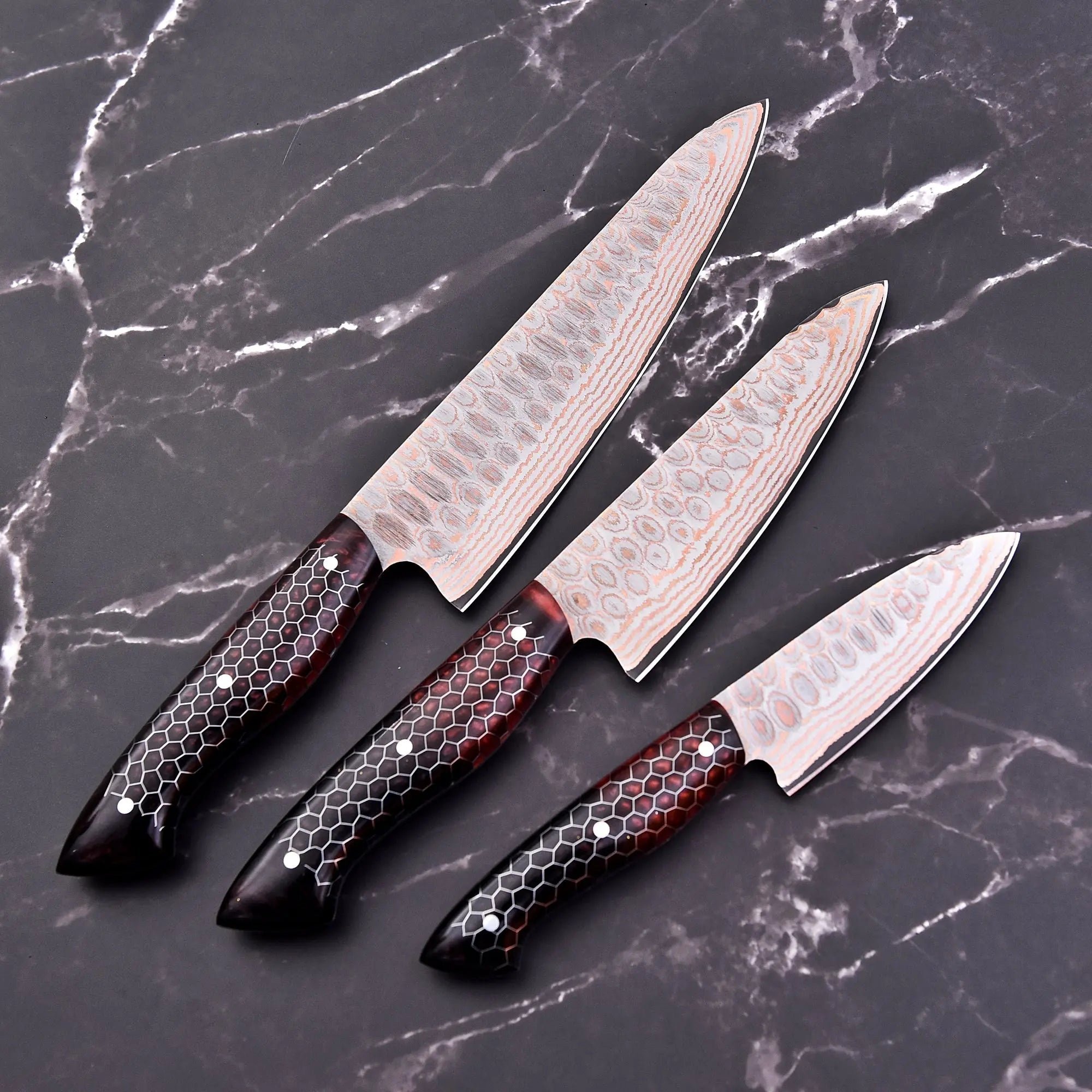 Honeycomb Knife Set | 3 Pcs | Clad Copper Damascus Blade | Faneema Cutlery