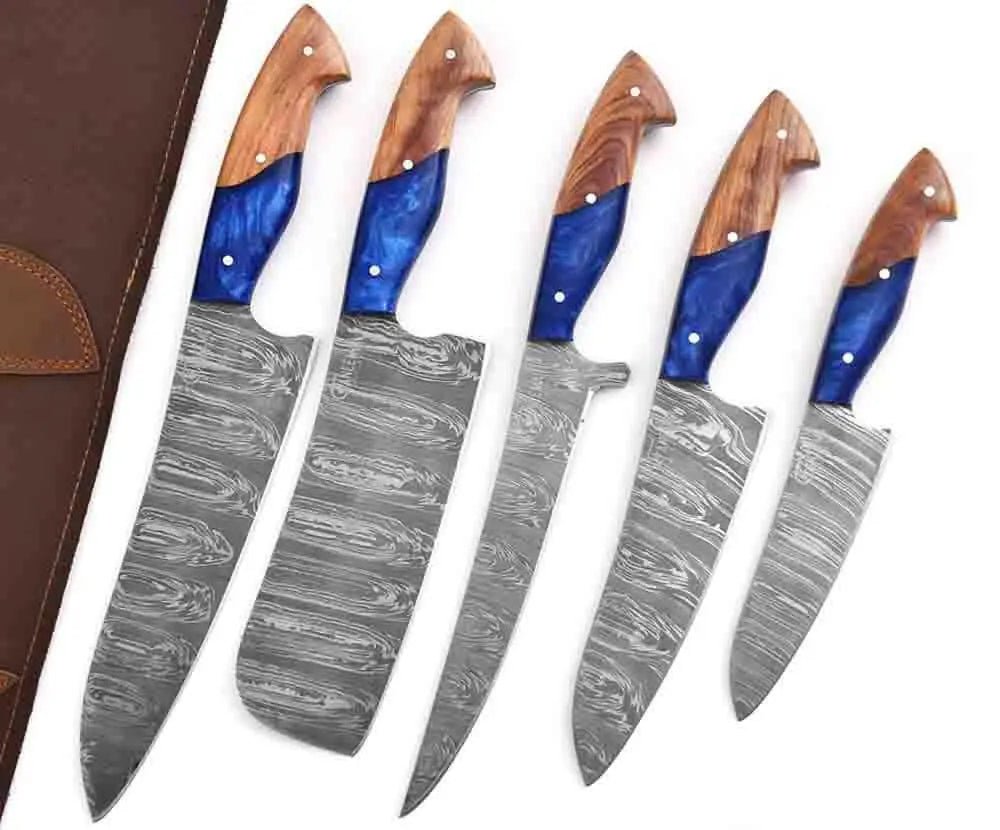 Our Damascus kitchen knife set has a beautiful sapphire blue and olive wood handle. The handle is designed for comfort. It also has a hand-forged Damascus steel blade. This makes it a comfortable choice for everyday use.