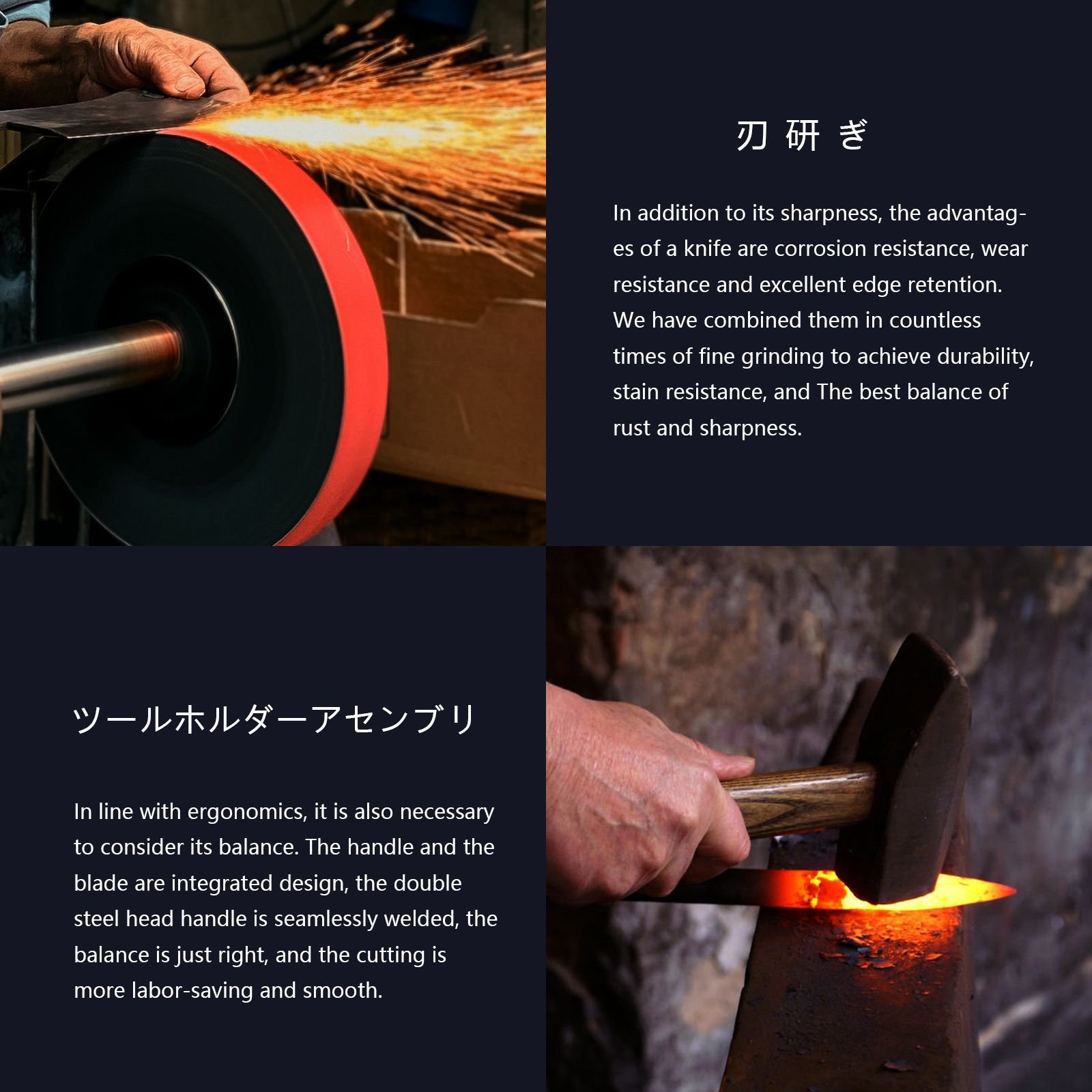 • [HAMMERED BLADE]The blade is hammered by hand. The hammered design on the blade minimizes food sticking. Each side is hand-ground at a 15° angle to enhance the sharpness of the V-shape. To ensure the longevity of the blade, do not wash and cut bones, frozen meat, or other hard materials in the dishwasher.