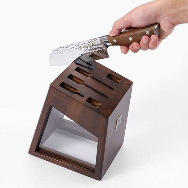 • Its knife holder is made of black walnut wood with acrylic, which is beautiful and easy to store.