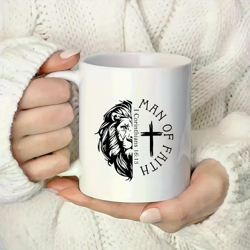 1 "for Man of Faith" 11oz Ceramic Coffee Mug with Lion & Cross Design - Inspirational Quote, Ideal for Husband, Dad,