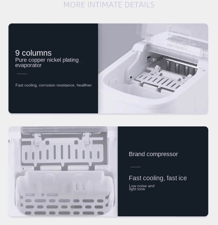 With its modern design, this portable ice maker not only ensures a steady supply of ice, but also adds a touch of elegance to any space.Its compact size is easy to store and transport, making it ideal for small kitchens, offices and dormitories.
