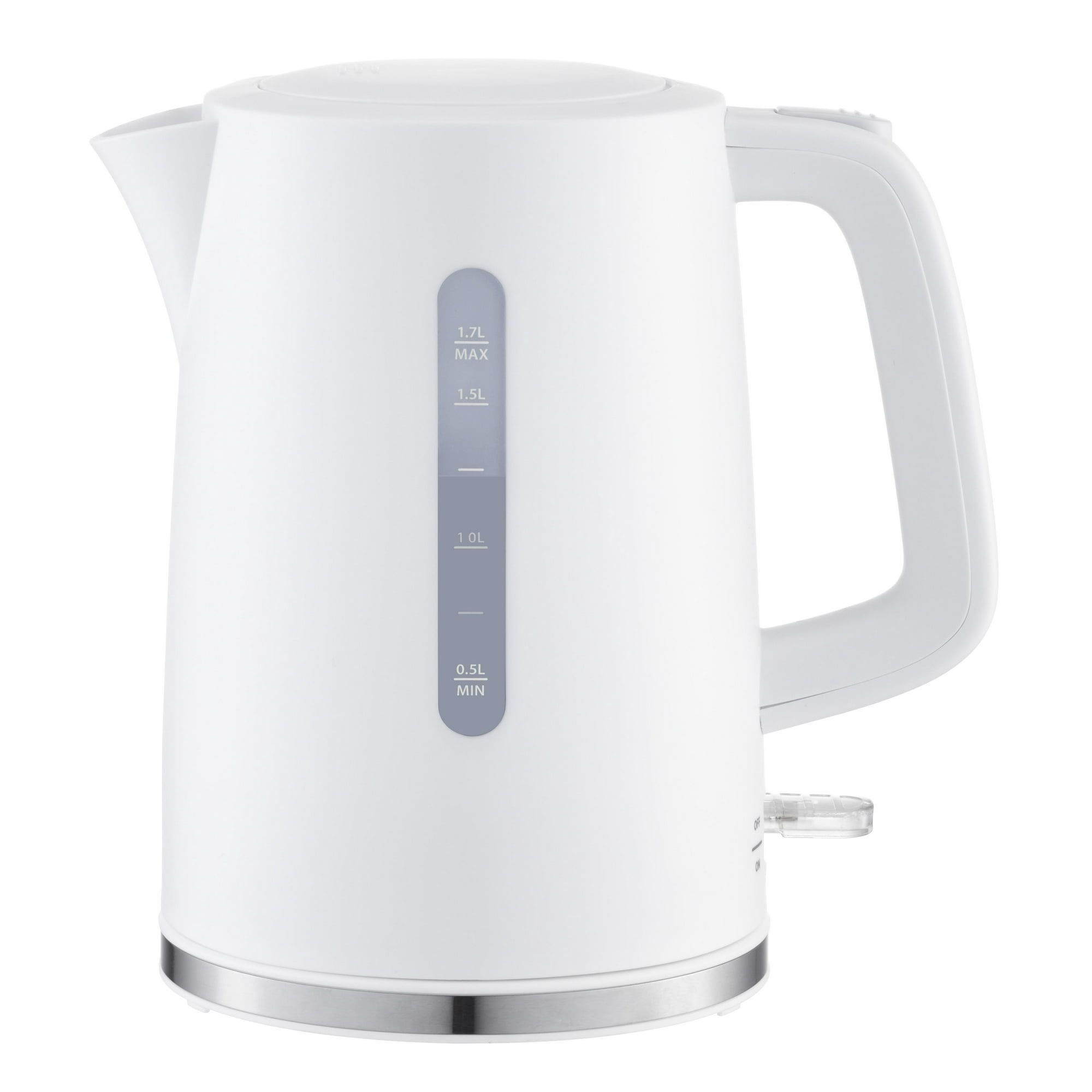 Safety Features: Includes automatic shut-off, boil-dry protection, and a safety locking lid for secure operation.User Convenience: Features a cordless design with 360-degree rotation, detaching from the base for easy serving and handling.Capacity & Design: Offers a maximum capacity of 1.7 liters, with a semi-transparent water gauge and a concealed heating element.Durable Construction: Made from high-temperature resistant plastic in a bright white color, ensuring durability and a clean aesthetic.