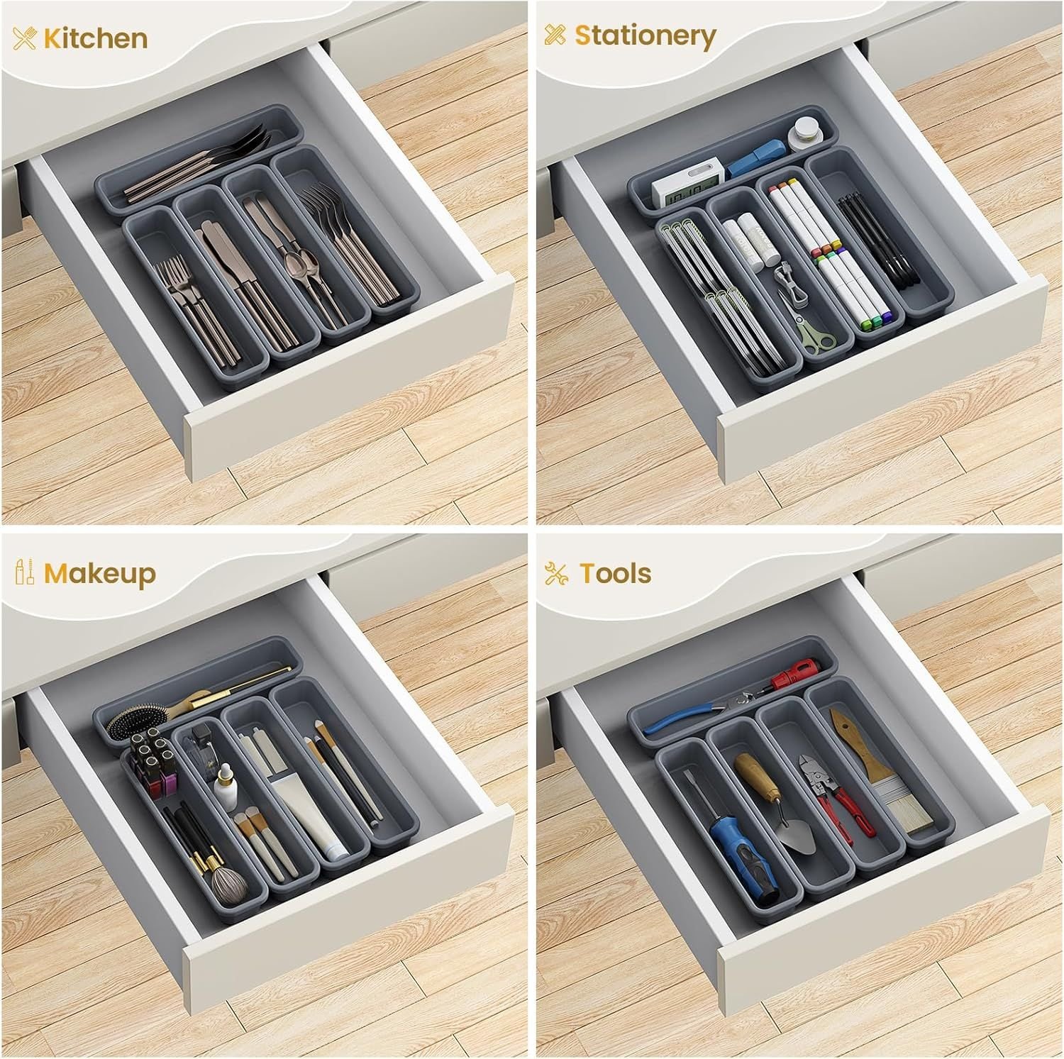 5 Pack Silicone Drawer Organizer for Kitchen, DIY Free Combination Silverware Organizer, Utensil Drawer Organizer, Moisture-proof and Heat-resistant up to 200°C, Anti-slip and Environmentally (Grey)