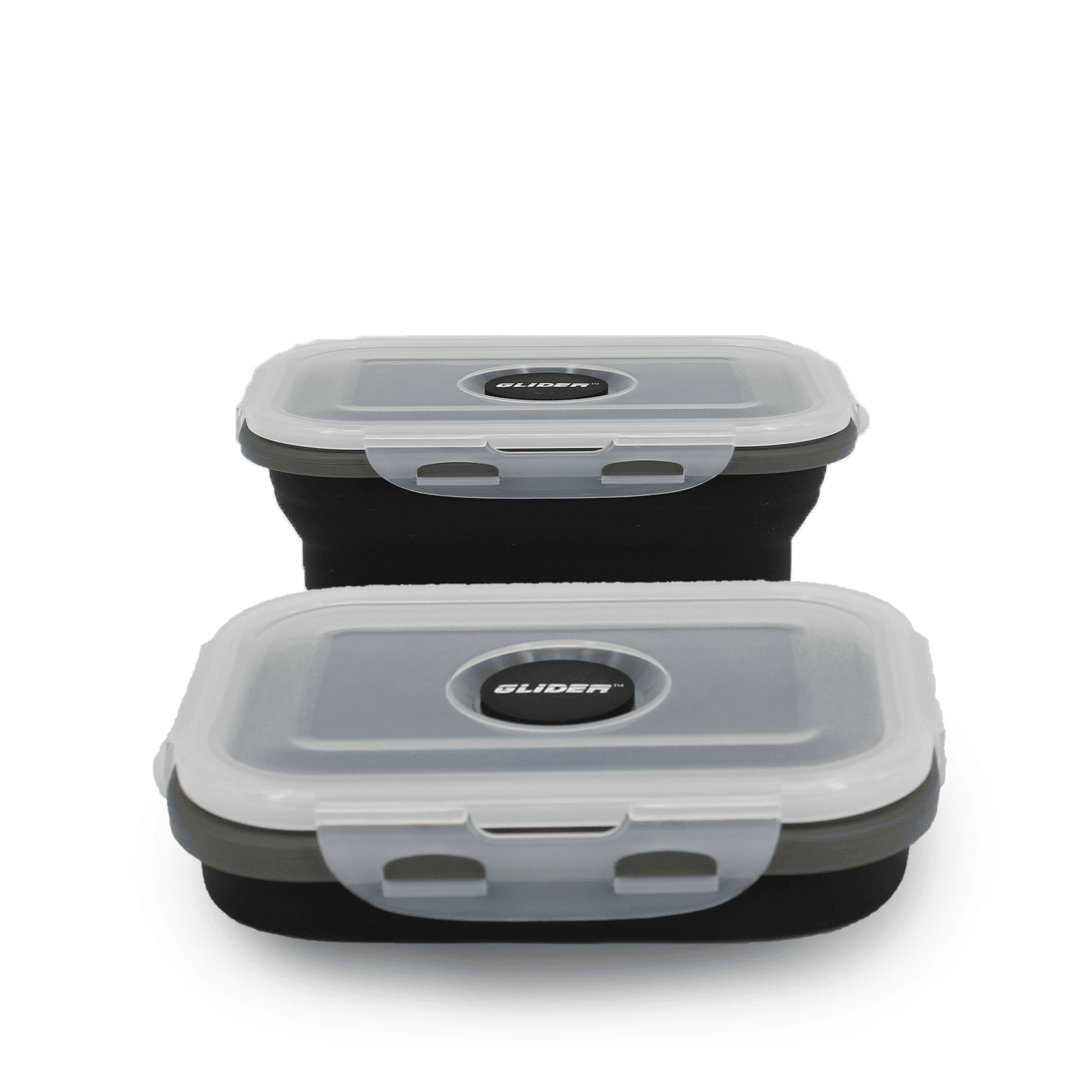 Glider Collapsible Bento Box Set are stylish and leak-proof silicone storage container set features breathable valve design, perfect silicone food container set for indoor food storage, outdoor activity, such as work, camping, hiking, travel and more. With a stylish collapsible design can carry more lunch needs. This storage container set is easy to unfold to create more space. This Lunch Box is BPA Safe, Microwave safe without lid and dishwasher safe.Glider snap on lids create an airtight vacuum seal that will keep your food secured and fresher longer. Featuring an air vent for microwave heating and four convenient sizes, this versatile set is the perfect solution for your different food storage needs.X-Large - Size;8.66x5.59x3.07inch/1.37inch Volume:1200mlLarge - Size:7.48X4.92X2.91/1.33 Inch Volume: 800ml,Medium - Size : 6.61x4.33x2.55/1.18Inch Volume: 450mlSmall - Size: 5.30X3.93X2.55Inch /1.18 Inch Volume: 350ml