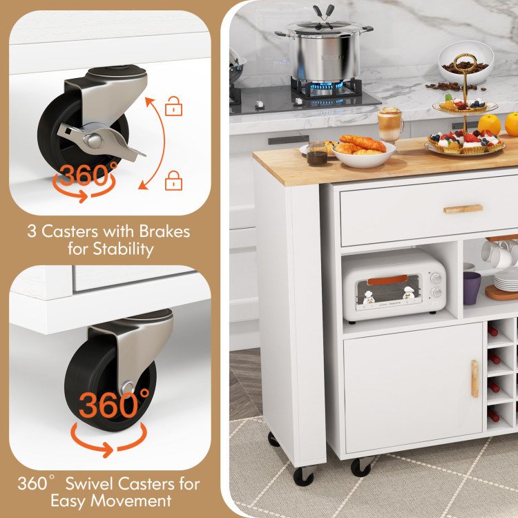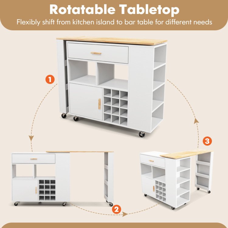 ● 2-in-1 Reversible Kitchen Cart: Can not only this kitchen island serve to be a mobile serving cart, but also be used as a food prep workstation. The rotatable tabletop is relatively much more convenient in use, which allows you to flexibly shift from kitchen island to the bar table for different needs.